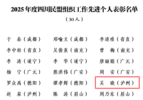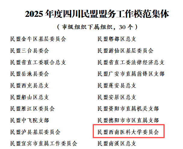 民盟西南医科大学委员会获评2025年度四川民盟“盟务工作模范集体”,吴晓荣获2025年度四川民盟“组织工作先进个人”。