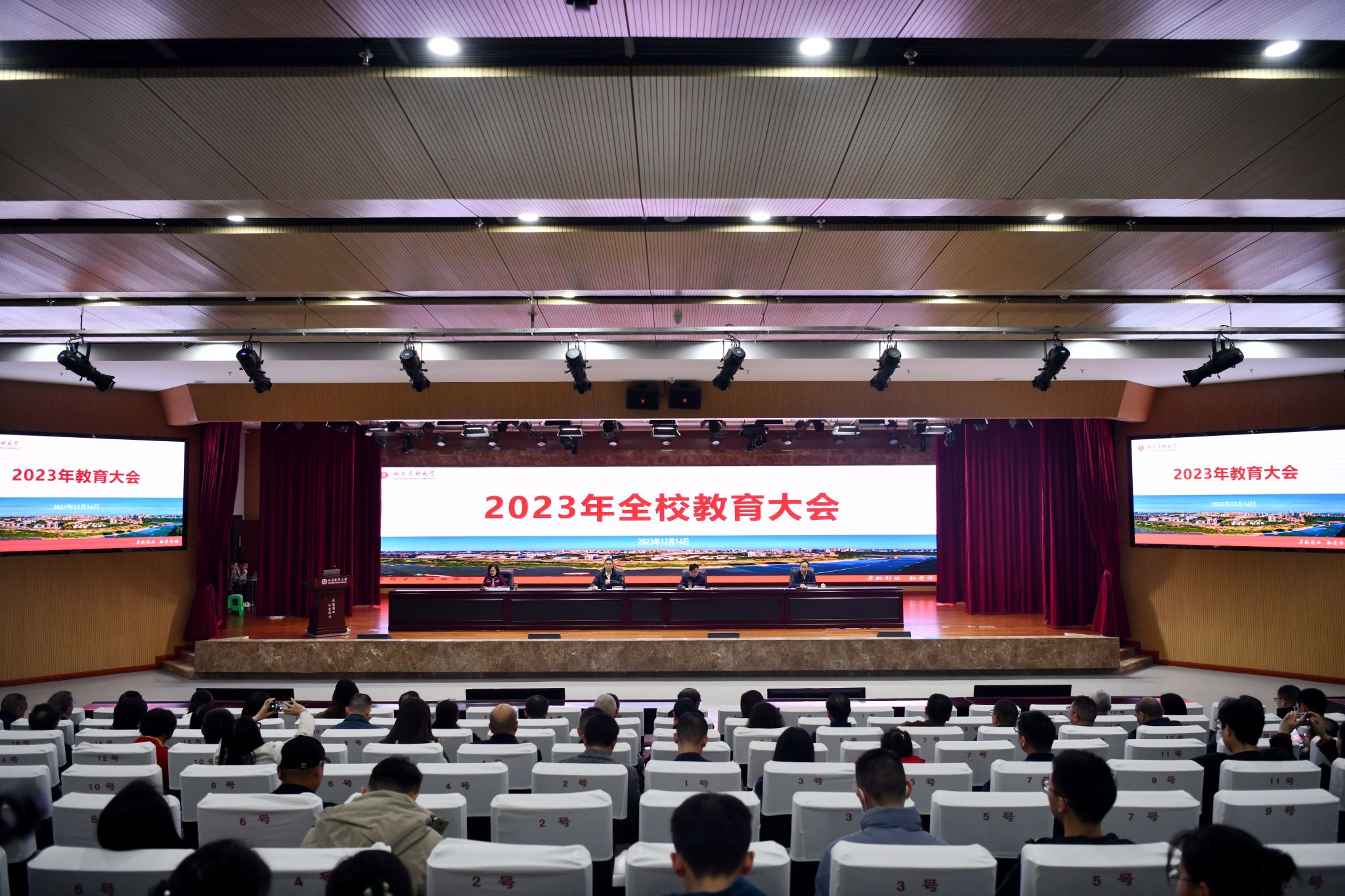 12月14日下午,西南医科大学2023年教育大会在城北校区第一学术报告厅召开。大会以“凝心聚力 踔厉奋发 奋力谱写西南医大教育工作内涵式高质量发展新篇章”为主题,总结成绩、表扬先进、展望未来。学校领导廖斌、张春祥、刘毅、聂敏海出席会议。会议由党委副书记、工会主席刘毅主持。本次会议采取现场与视频直播的方式进行。
