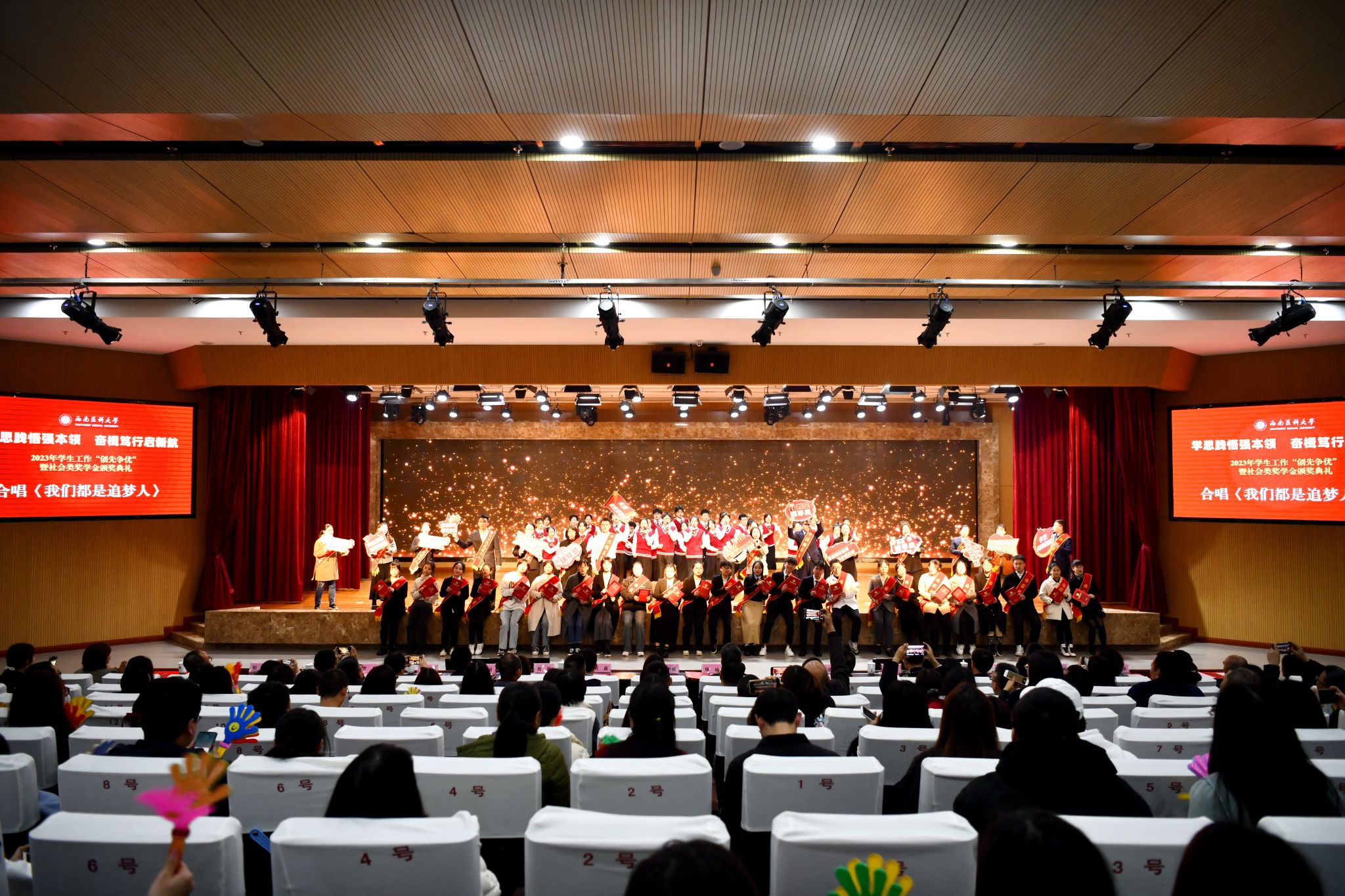 在《我们都是追梦人》的激昂合唱中,“学思践悟强本领 奋楫笃行启新航”2023年学生工作“创先争优”暨社会类奖学金颁奖典礼圆满落下帷幕。