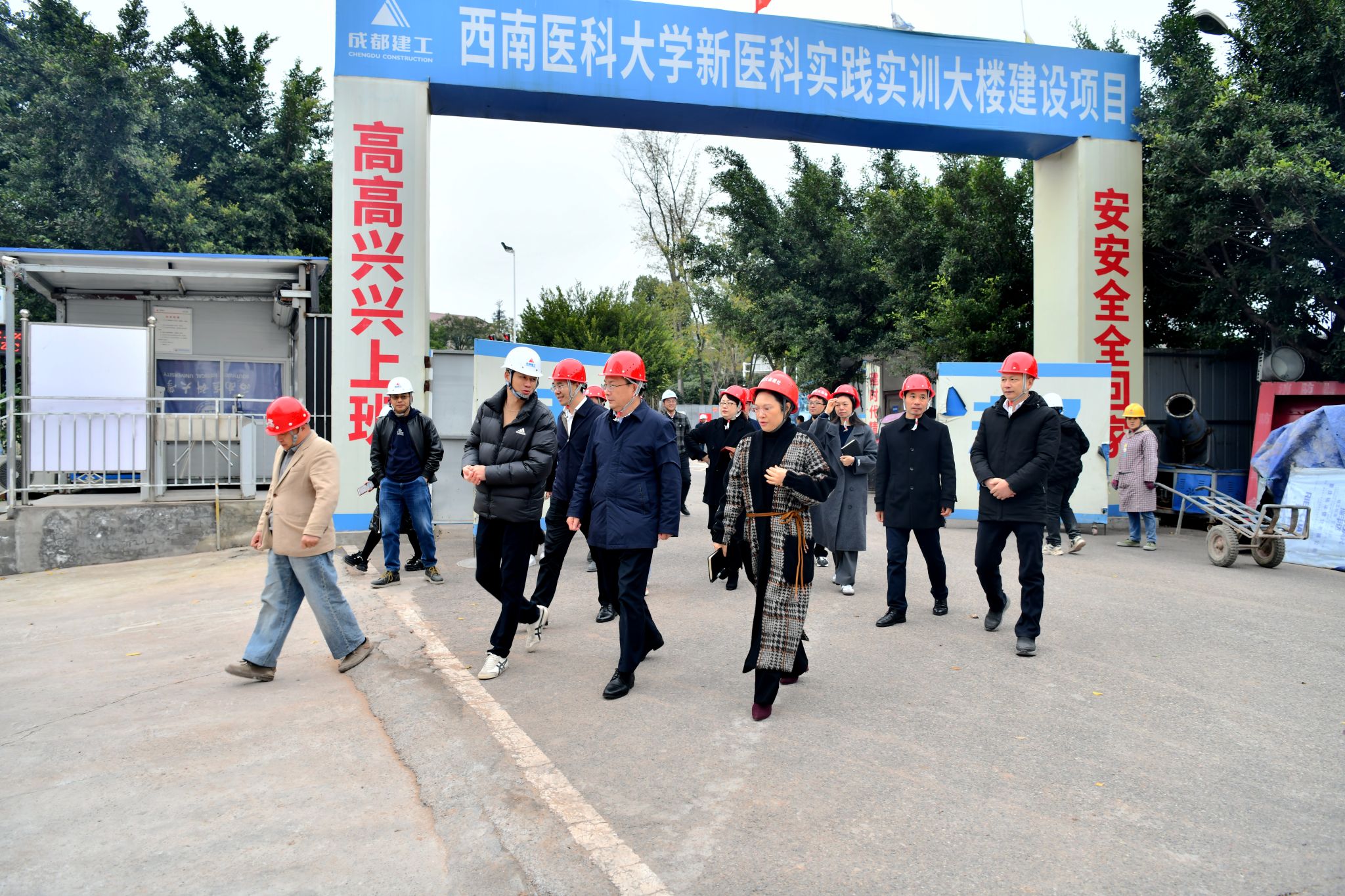 12月15日下午,学校党委副书记、校长张春祥,党委常委、副校长赵领率党政办、宣传部、财务管理处、审计处、基建后勤处等职能部门及项目施工单位、监理单位主要负责人到新医科实践实训大楼建设项目工地现场视察,督导项目建设推进情况。