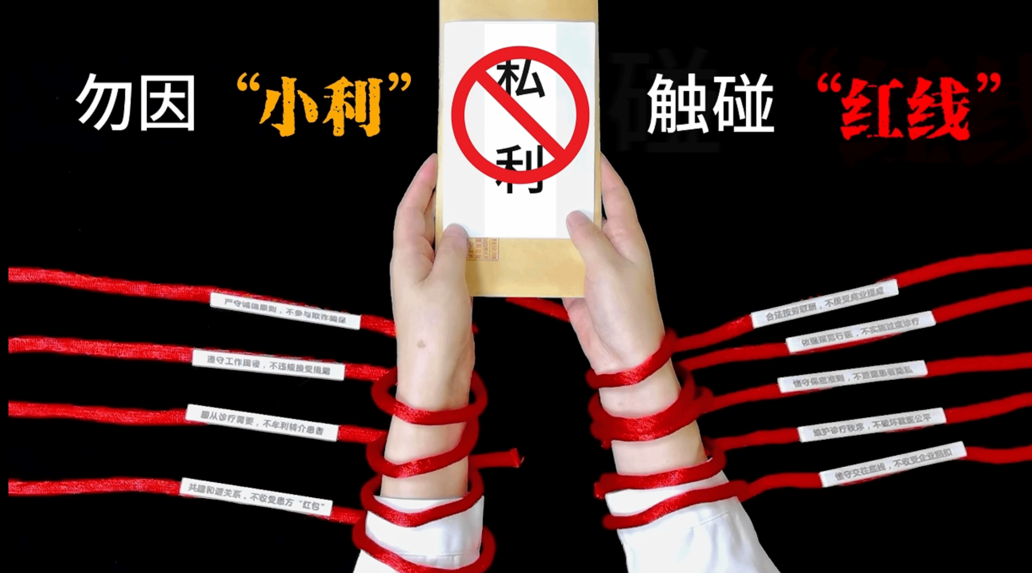 为进一步贯彻落实习近平新时代中国特色社会主义思想,增强医疗卫生人员的责任感、使命感、荣誉感,切实规范执业行为,弘扬新时代医疗卫生人员职业精神,引导形成风清气正的行业环境,保障医疗卫生事业高质量发展,20211112,国家卫生健康委、国家医保局、国家中医药局制定了《医疗机构工作人员廉洁从业九项准则》(简称《九项准则》)。《九项准则》实施以来,为广大医疗机构工作人员划清了基本行为底线,在各级医疗机构起到了警示教育作用。微视频作品《红线》以《九项准则》为蓝本,通过九个小案例模拟场景,用写意的拍摄手法,将“红线”贯穿整个影片,明确表达了对《九项准则》明令禁止的行为都是不可触碰的红线,警示医疗机构工作人员勿因“小利”,触碰“红线”。
