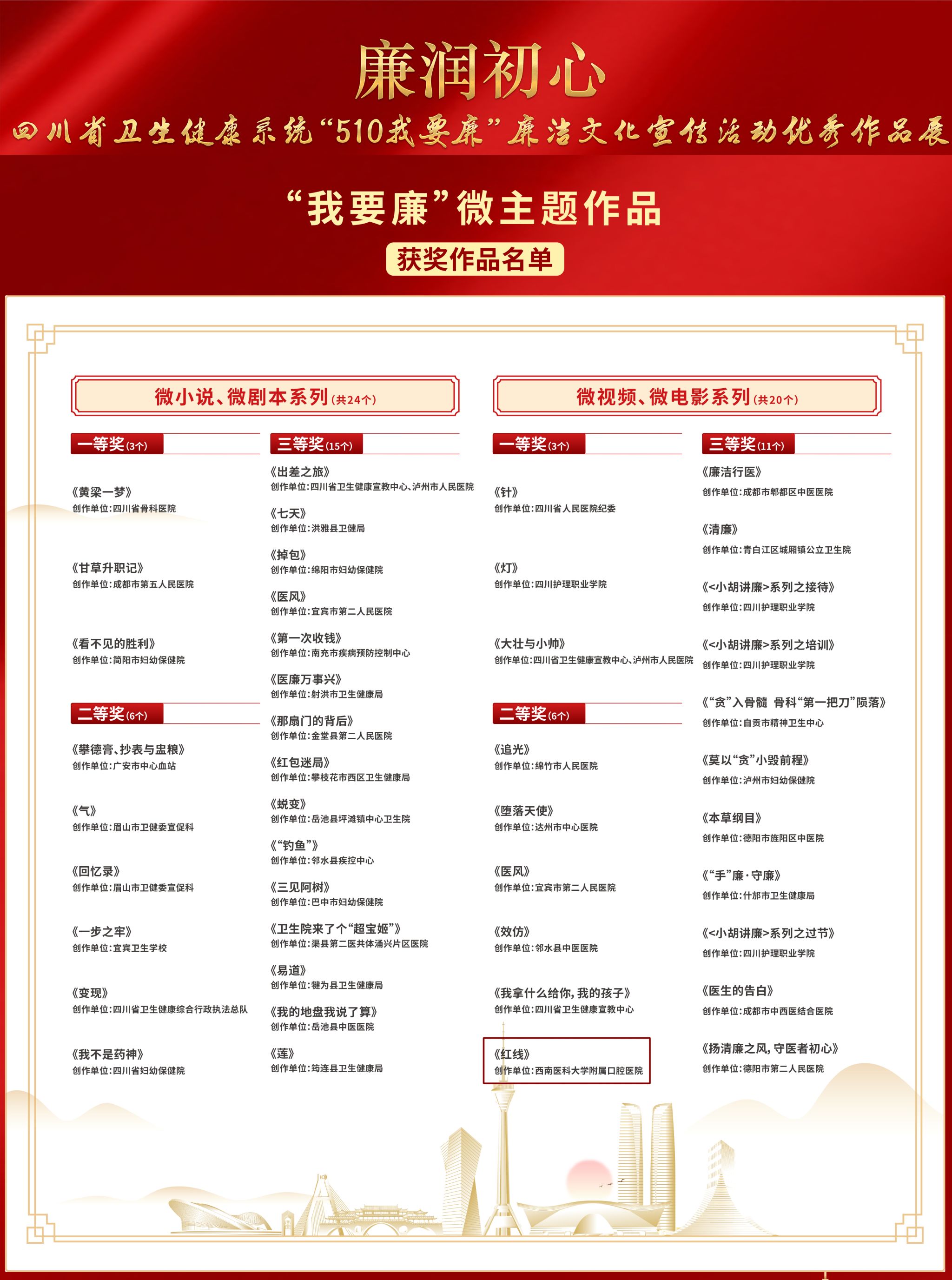 近日,省卫健委举办了四川省卫生健康系统“510我要廉廉洁文化宣传活动优秀作品展活动,口腔医学院·附属口腔医院制作报送的微视频《红线》荣获我要廉微主题作品微视频类二等奖。