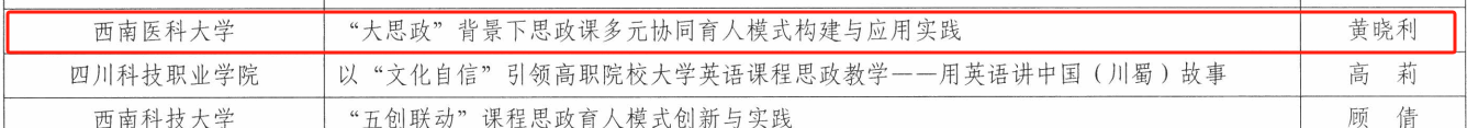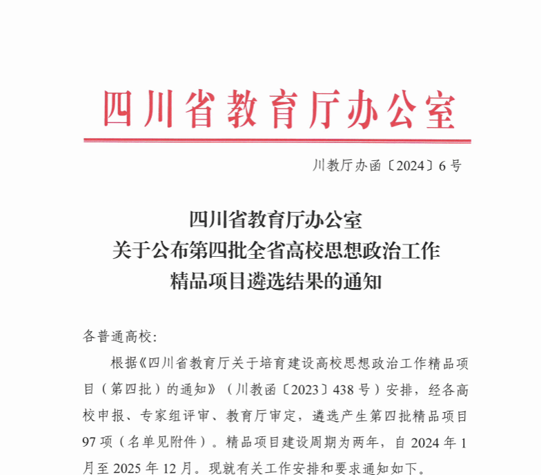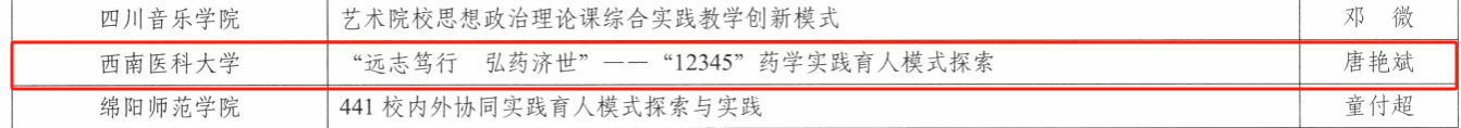 近日,四川省教育厅公布第四批全省高校思想政治工作精品项目遴选结果,我校成功入选2项,即马克思主义学院申报的《“大思政”背景下思政课多元协同育人模式构建与应用实践》入选课程育人项目、药学院申报的《“远志笃行 弘药济世”--“12345”药学实践育人模式探索》入选实践育人项目。