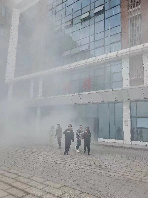 16:00,演练正式开始。学校在弘润楼舍1楼、3楼、6楼点燃烟雾,假想弘润楼1楼、3楼、6楼某实验室发生火灾,随即火灾警报拉响,播音广播播放“火灾发生,请全体人员立即疏散”。接到指令后,所有疏散员、引导员立即到位,指挥引导全体师生按照疏散路线,并用手帕、纸巾等捂住口鼻,低头弯腰穿过浓烟,有序疏散。演练中,师生员工服从指挥、配合密切、行动迅速、紧张有序,仅仅3分钟,200余名师生全部疏散至安全区域。随后,保卫人员进楼逐层查看有无逗留人员,整个演练过程井然有序,达到预期效果。