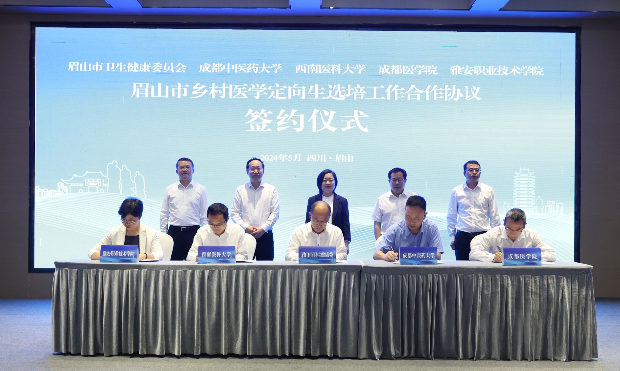 活动中,眉山市卫生健康委与西南医科大学、成都中医药大学、成都医学院、雅安职业技术学院共同签署《眉山市乡村医学定向生项目合作协议》,计划3年内通过定向选培签约的方式为眉山市乡镇卫生院培养医学专业定向生300名。