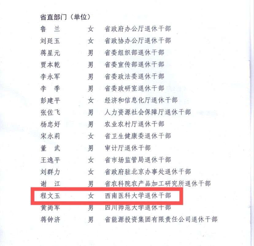 近日,中共四川省委老干部局下发关于通报表扬全省优秀老干部志愿服务者的通知,决定对全省范围内100名优秀老干部志愿服务者予以通报表扬,学校原党委副书记、正厅级调研员程文玉荣获“全省优秀老干部志愿者”称号。