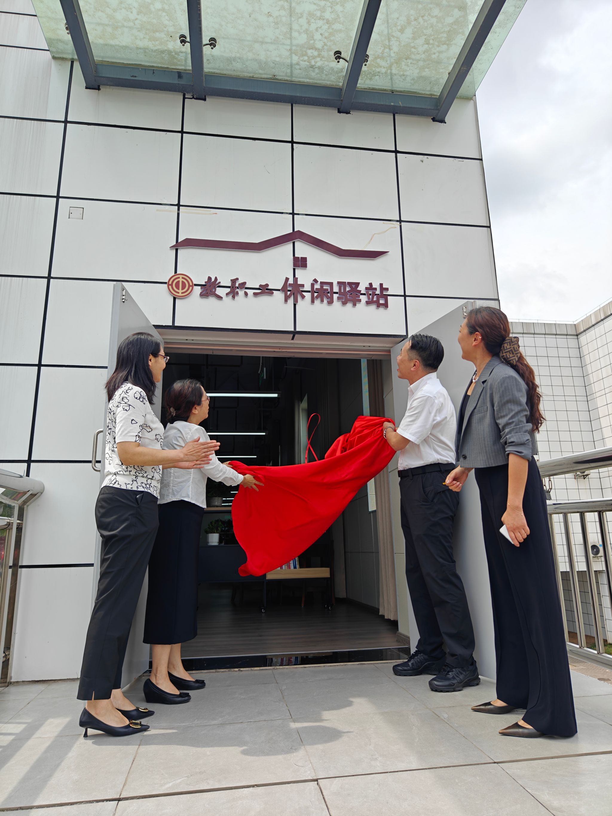 仪式上,刘毅、唐柯、孙鸿燕、张晓燕共同为“教职工休闲驿站”揭牌。