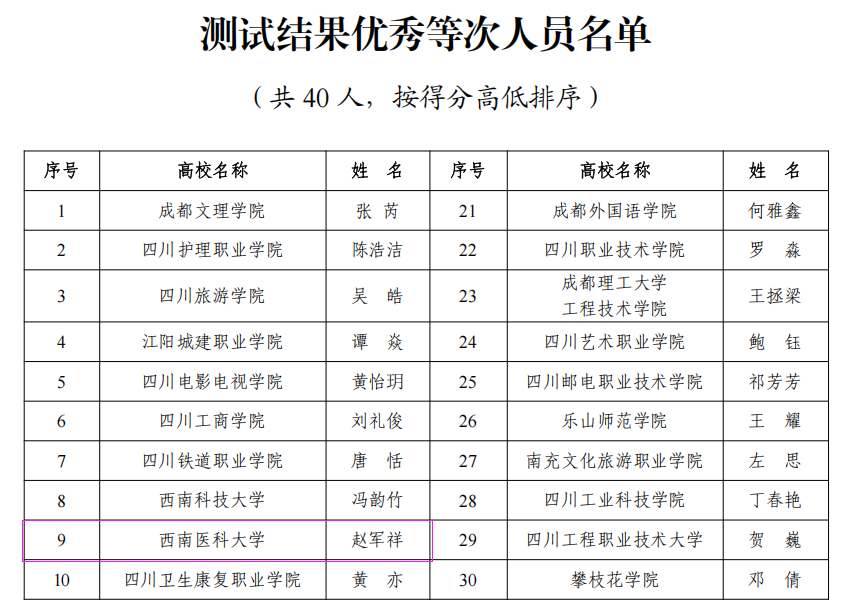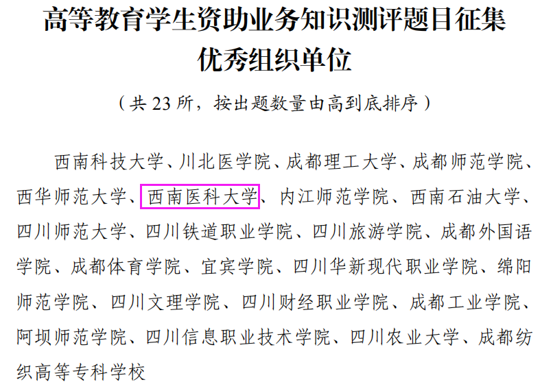 近日,四川省学生资助管理中心发布关于高等教育学生资助业务知识测评题目征集及测试结果的通报,我校获高等教育学生资助业务知识测评题目征集优秀组织单位,2名教师获个人表扬。