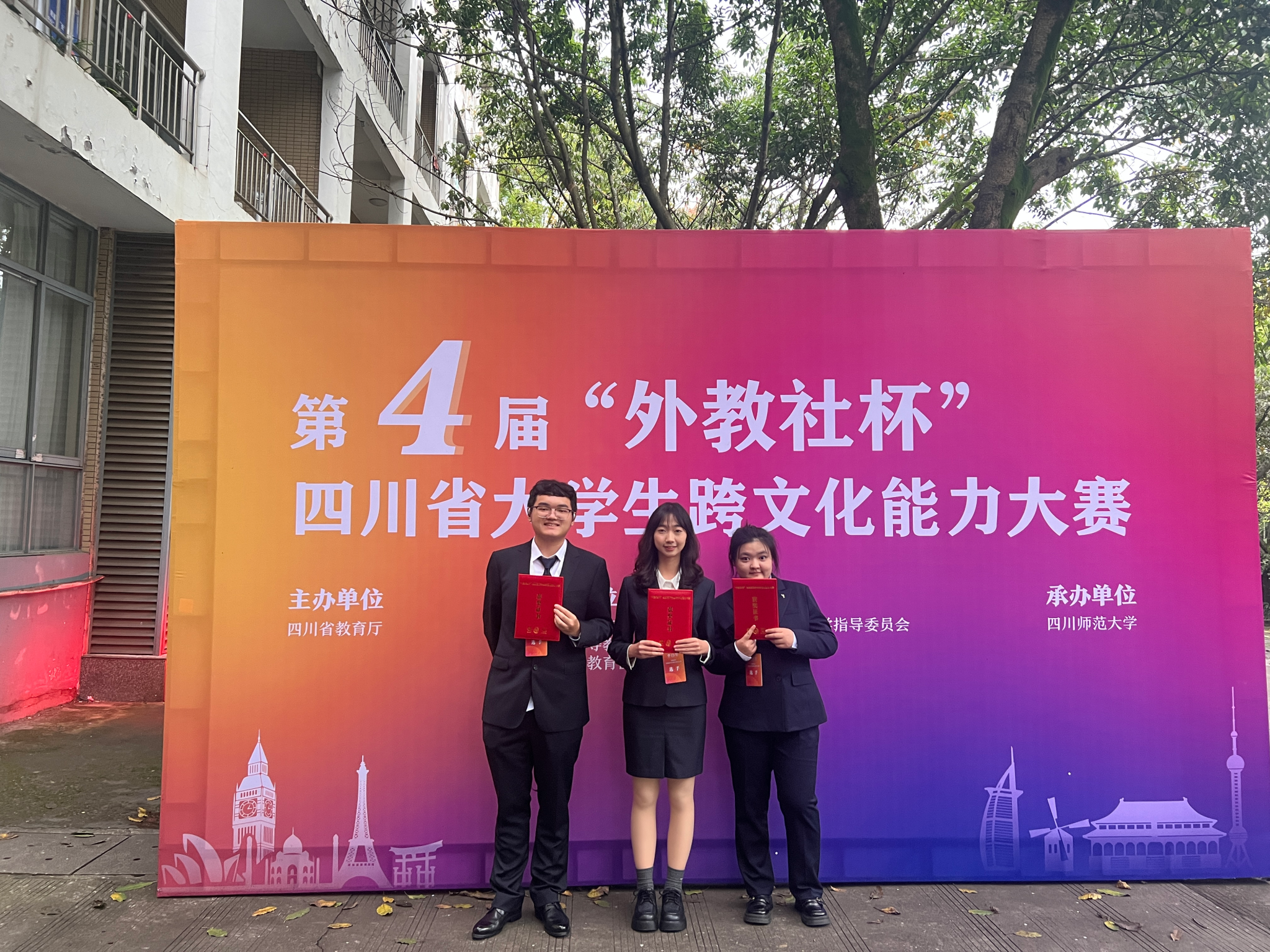 11月2日,由省教育厅主办,四川省普通本科高校外国语言文学类专业教学指导委员会、四川省高等教育学会高校外语专业委员会和上海外语教育出版社协办,四川师范大学承办的第四届“外教社杯”四川省大学生跨文化能力大赛决赛圆满落下帷幕。经过激烈角逐,我校3名参赛学生凭借出色表现脱颖而出,荣获二等奖,充分展现了我校学子优秀的跨文化沟通能力、国际视野与语言表达水平。