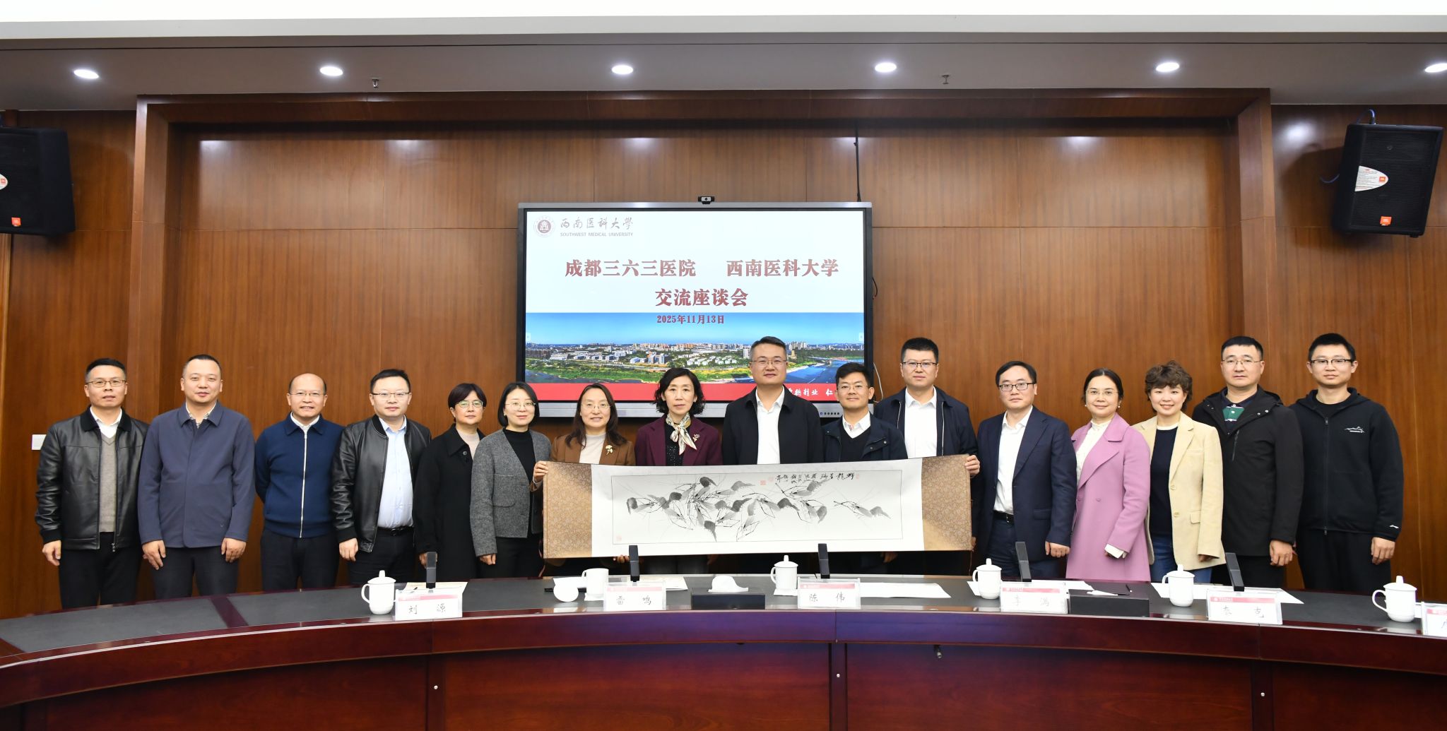 会前,学校教务处陪同成都三六三医院参观了学校校史馆,会后学校与两家医院进行了合影留念。