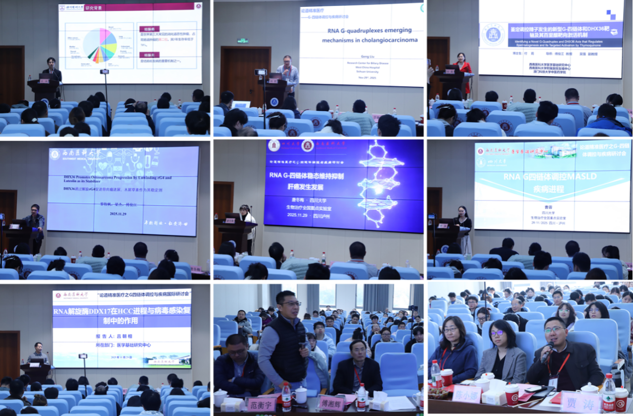 青年学者论坛中,温州医科大学吴一航博士介绍《TMPYP4缓解DSS诱导的小鼠结肠炎的机制研究》;四川大学刘更副研究员分享《RNA G-四链体在肝内胆管癌中的功能和机制研究》;澳门科技大学付莉博士讲解《鉴定调控精子发生的新型G-四链体和DHX36靶轴及其百里醌靶向激活机制》;澳门科技大学黎牧帆博士探讨《DHX36 promotes osteosarcoma progression by unwinding rG4 and luteolin as its stabilizer》;我校吕朝相副研究员报告《RNA解旋酶DDX17在HCC进程与病毒感染复制中的作用》;四川大学唐冬梅、曹蓉博士分别分享《RNA G-四链体稳态维持抑制肝癌发生发展》《RNA G四链体调控MASLD进程》的最新发现。
