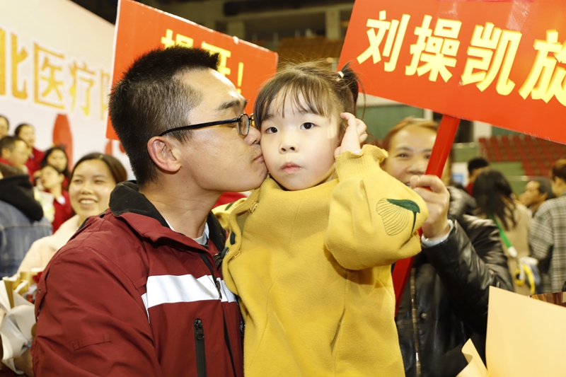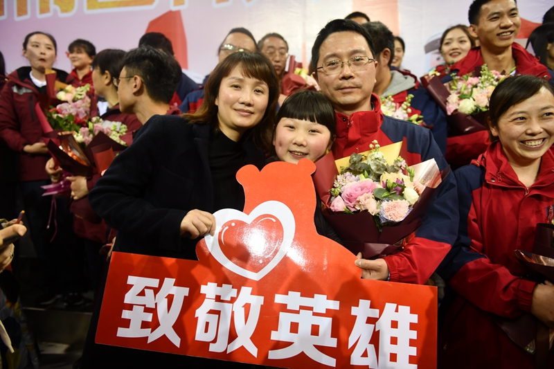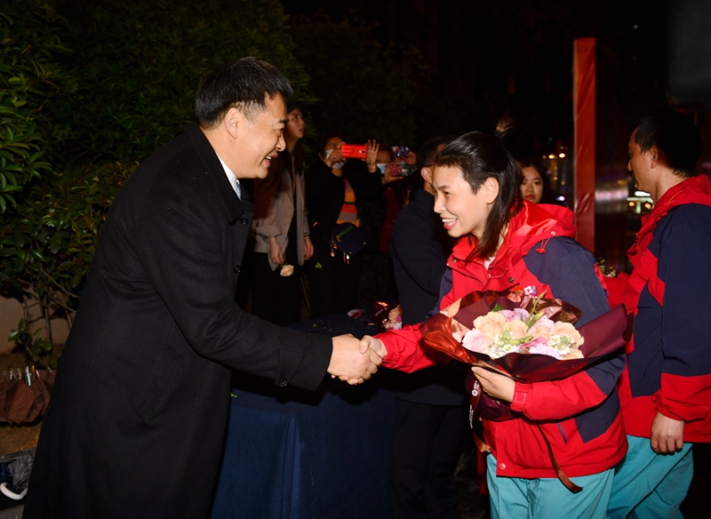 4月3日20时48分,载着55名医护人员的两辆汽车稳稳地停靠在奥林匹克体育公园。刘强、鞠丽、刘云、马宗慧、廖斌、张春祥等站在车前迎接医护人员凯旋,与他们一一握手,欢迎他们回家。