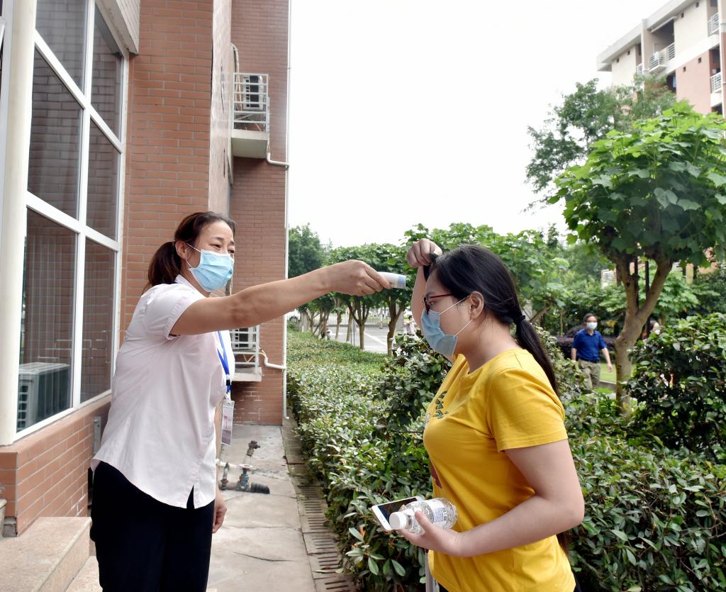 “同学,请间隔1米以上排队进入”“同学,私家车和家长不能入内”“同学,请依次测量体温”……在奥体中心体育场外,校卫队员不断重复着以上话语,引导学生排队入场。