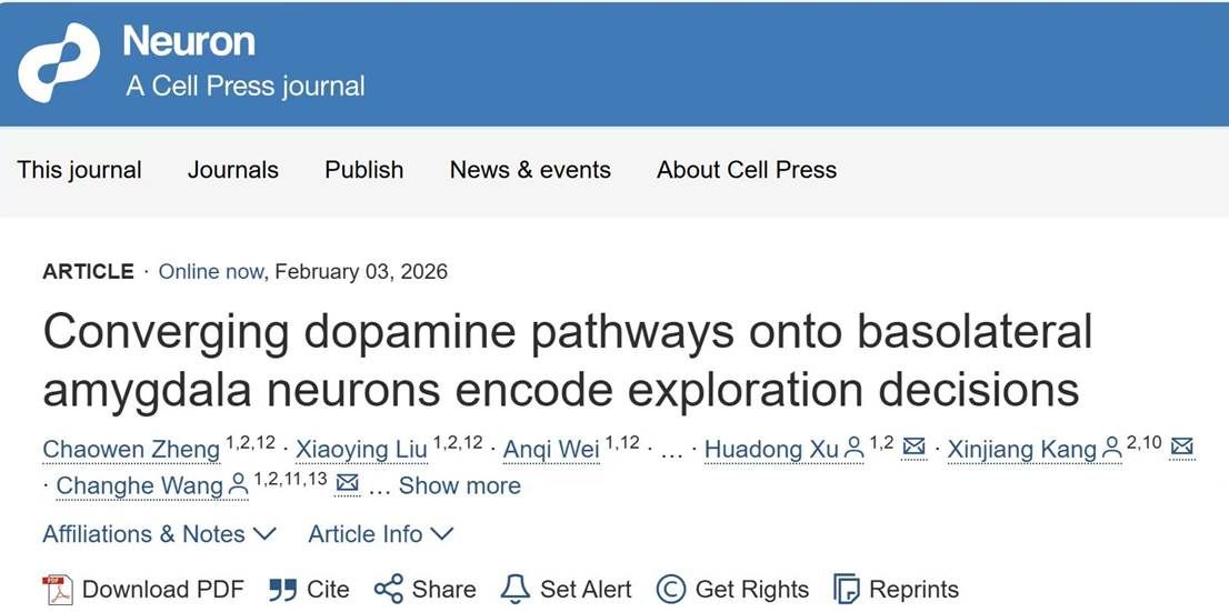 2月4日,西南医科大学心血管医学研究所康新江团队在神经科学顶级期刊《Neuron》杂志上发表了题为“Converging dopamine pathways onto basolateral amygdala neurons encode exploration decisions”的研究论文,明确了中脑多巴胺系统是探索决策的关键枢纽,揭示了探索决策的多巴胺共轭投射环路整合机制,建立了多巴胺偏向性突触传递理论新模型,为理解复杂环境下多维信息整合及相关本能行为障碍的干预提供了重要理论依据。