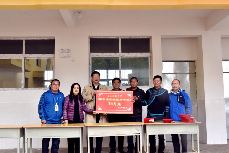 座谈会后,廖斌一行在昭觉县相关领导的陪同下,赴龙沟乡进行实地考察。在龙沟乡人民政府举行了帮扶捐助仪式,学校向昭觉县龙沟乡金野以匹村捐赠了65万元。在龙沟乡中心学校,向该校捐赠了15万元,用于改善办学条件;同时举行了“育蕾基金”发放仪式,7名教师,80名同学获得奖励。在龙沟乡卫生院,看望了医疗人员,了解他们的工作生活情况,并向卫生院捐赠5万元用于改善医疗条件。