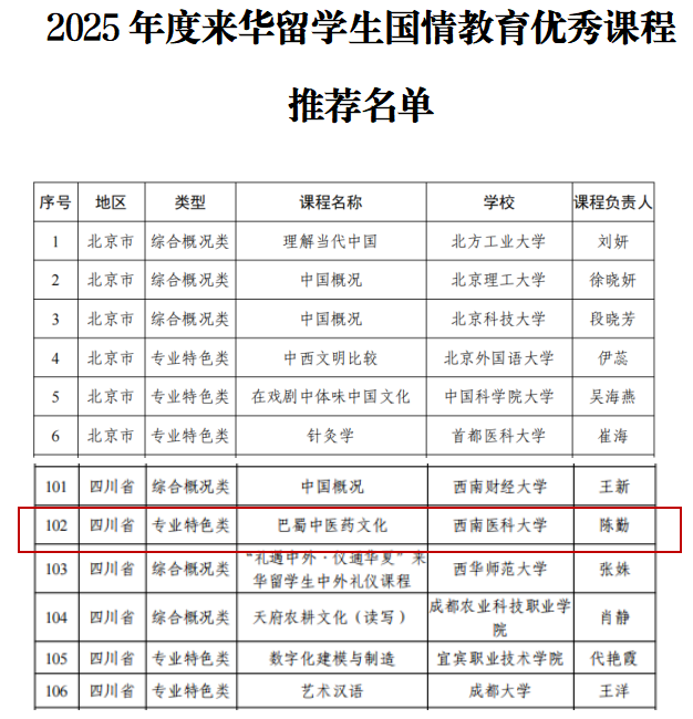 近日,受教育部国际合作与交流司委托,中国教育国际交流协会发布了2025年度来华留学生国情教育优秀课程评选结果。我校《巴蜀中医药文化》课程成功入选(四川省共6门)。这是我校首次入选教育部来华留学生国情教育课程,体现了学校在来华留学生国情教育方面的国家级突破。