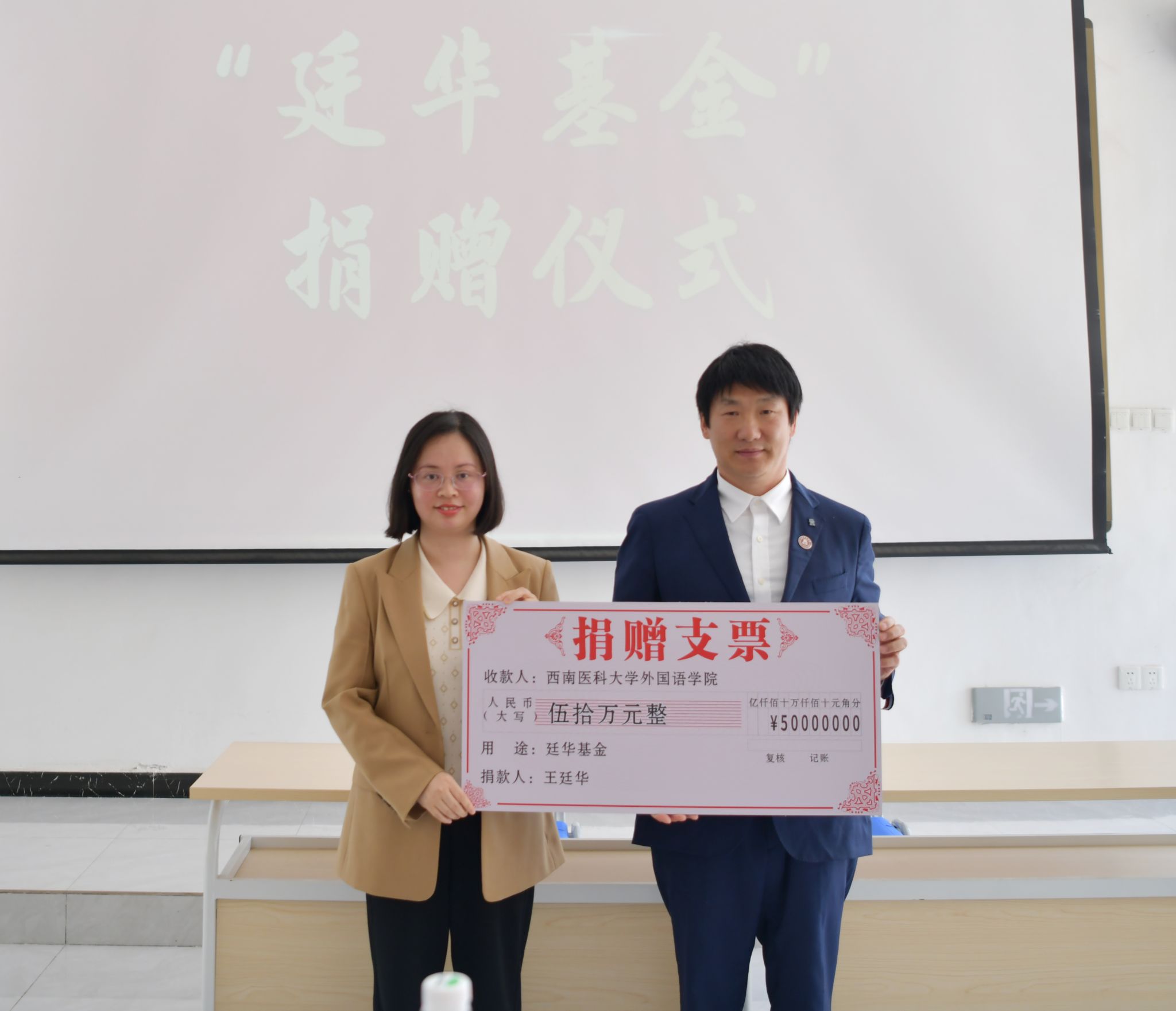 在“廷华基金”捐赠仪式上,王琳介绍了基金的设立背景、目的及管理使用办法。该基金由王廷华捐资设立,连续五年每年提供10万元专项支持资金,用于支持外国语学院学生创新创业、学业发展及教师教学科研能力提升。陶瑞宇代表学校与王廷华现场签署了捐赠协议。王廷华向学院递交捐赠支票。