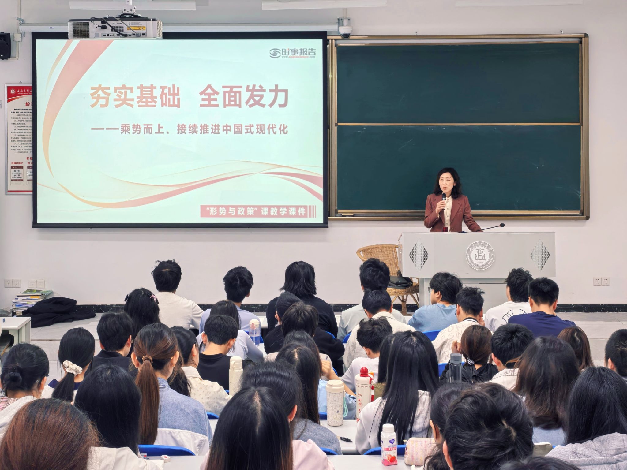 4月30日, 学校党委副书记、校长何涛以《乘势而上、接续推进中国式现代化》为题,在学海楼316室为2025级中西医临床医学专业学生讲授了一堂精彩的“形势与政策”课。