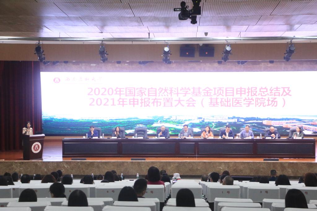 为全面总结2020年国家自然科学基金项目申报工作经验,科学分析基础医学院目前科研工作存在的问题,做好2021年国家自然科学基金项目的申报工作,10月19日19:00,学校在德诚楼学术报告厅召开了2020年国家自然科学基金项目申报总结及2021年申报工作布置基础医学院专场会。学校主持行政全面工作副校长张春祥、副校长何涛,相关职能部门和药学院、公共卫生学院、护理学院、医学信息工程学院、体育学院主要负责人,基础医学院全体教职员工和在读研究生300余人参加了会议。会议由何涛主持。