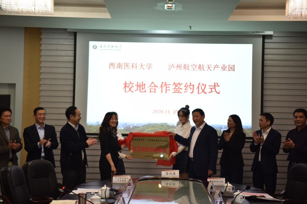 医学信息与工程学院院长罗亚梅与泸州航空航天产业园区管委会主任刘宇分别代表学校和园区签署了校地合作协议,医学信息与工程学院党总支书记杨继宏与李宵为“医工融合 创新基地”揭牌。签约仪式上,刘宇介绍了泸州航空航天产业园区基本情况和合作背景;罗亚梅介绍了医学信息与工程学院基本情况及医工发展前景。