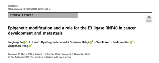 日前,我校医学基础研究中心傅俊江课题组与国内外专家合作,以题为“Epigenetic modication and a role for the E3 ligase RNF40 in cancer development and metastasis” 的文章在Nature子刊Oncogene上在线发表。Oncogene的SCI最新影响因子(IF)为:7.971。该篇综述中,作者系统总结了目前关于RNF40基因结构的知识以及RNF40在组蛋白H2B单泛素化、DNA损伤修复、细胞凋亡、癌症发展和转移中的作用,还强调了将这些信息应用于癌症诊治及预防的挑战,并强调迫切需要对RNF40作为癌症治疗的潜在靶点进行研究。