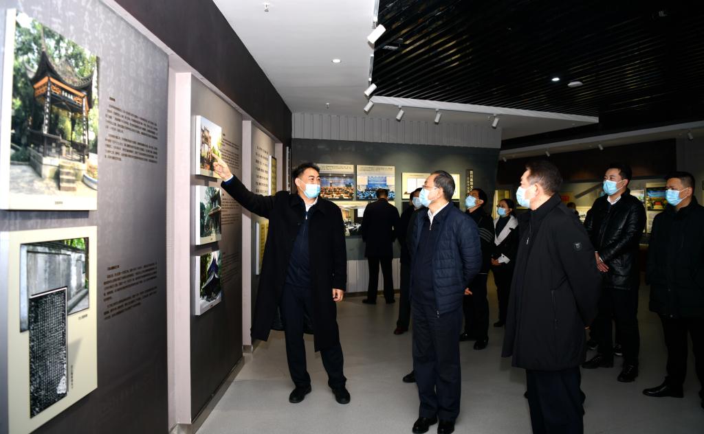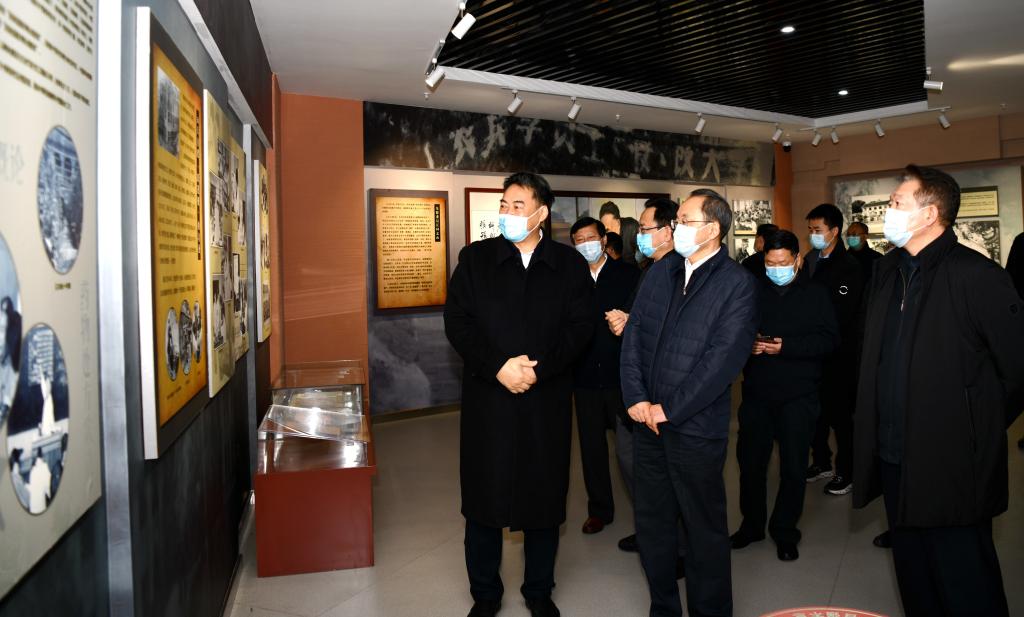 在校史馆门前,廖斌向王宁汇报了学校学习宣传贯彻党的十九届五中全会和省委十一届八次全会精神的开展情况,以及学校冬季疫情防控、党的建设、师资队伍、人才培养、科学研究、总规建设、脱贫攻坚和服务地方经济社会发展等方面开展的工作和取得的成绩。