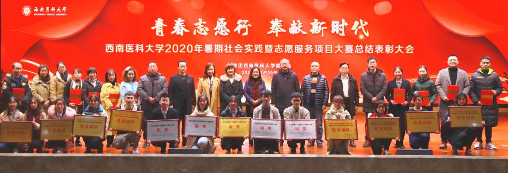党委宣传部·统战部部长柏珂宣读表彰文件。医学影像系“健康共助力,防治践于行”暑期社会实践队等8支团队获评“西南医科大学2020年大学生暑期社会实践优秀团队”,曾庆彧等10名教师获评“西南医科大学2020年大学生暑期社会实践优秀指导教师”,朱斌等320名同学获评“西南医科大学2020年大学生暑期社会实践优秀个人”。