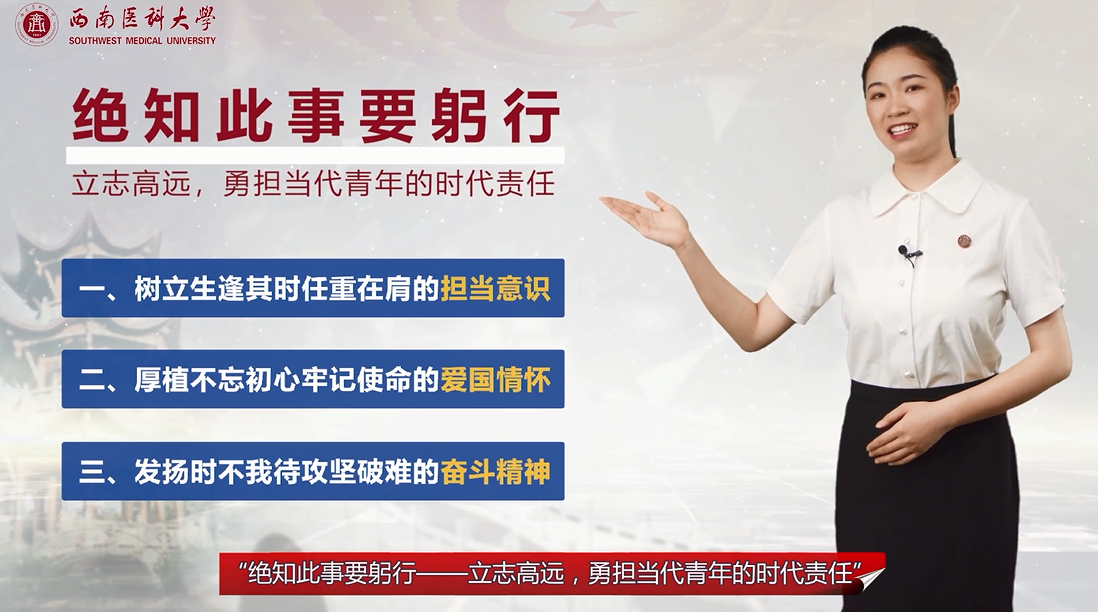 作品立足于当代青年大学生的理想信念问题,结合《思想道德修养与法律基础》课程要求、时代背景、“疫情”形势,引用我校青年医生援鄂抗疫鲜活事例,从“树立担当意识”“厚植爱国情怀”“发扬奋斗精神”三方面分析当代青年大学生应如何担当时代责任,以青春之我创造青春之中国,为中华民族伟大复兴助力。