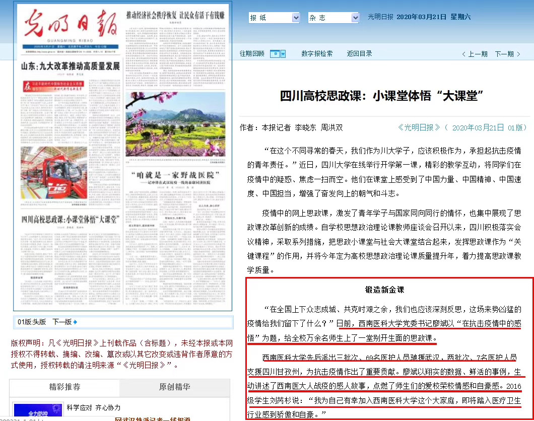 编者按:2020年是注定不平凡的一年。这一年,我们亲历抗疫的坚守,见证时代逆行者的勇气和智慧,以热血与担当为“十三五”画上浓墨重彩的句点。这一年,西南医大扎实推进疫情防控和各项事业发展,学校保持安全稳定,党的建设和事业发展取得显著成效。为了更好地回顾和总结本年度学校重大新闻事件,展示学校一年来取得的重要成果,现整理出学校2020年十大新闻如下: