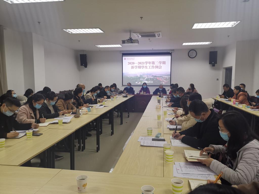 3月3日下午,学校在城北校区第二会议室组织召开2020-2021学年第二学期新学期学生工作例会。学校党委副书记刘毅,党政办、组织部、宣传部、教务处、武装保卫处、基建后勤处、财务管理处、信息与教育技术中心、研究生院等部门负责人,各院系分管学生工作领导、学生科长、年级主任以及学生工作部、团委全体处科级干部参加会议。会议由学生工作部副部长崔继东主持。