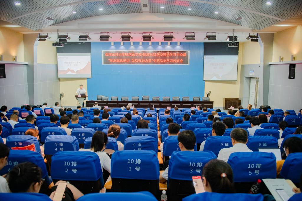 范生尧教授以“学党史 忆初心 永远跟党走”为题,讲述了学校和医院从建立之日起就根植的红色基因,讲述了一代代西南医大人接续奋斗和一件件具有里程碑意义的重大事件,并祝愿学校和医院在新的征途中举棹扬帆、勇立潮头,奋力开创西南医科大学和附属医院更加美好的明天。