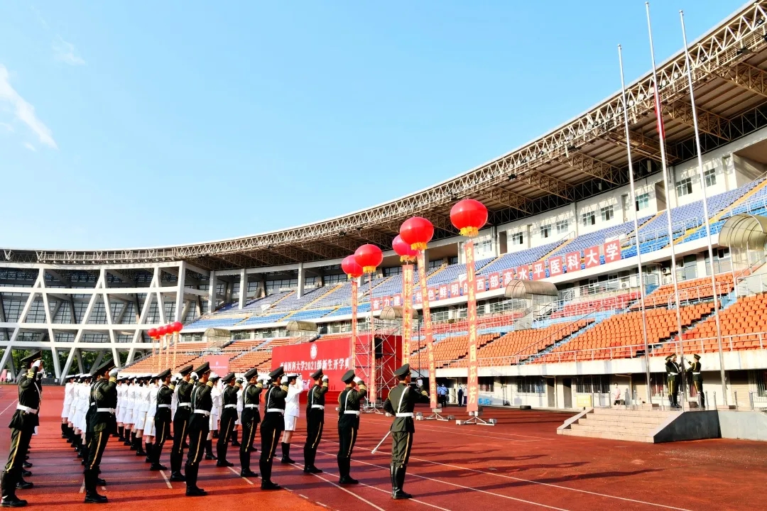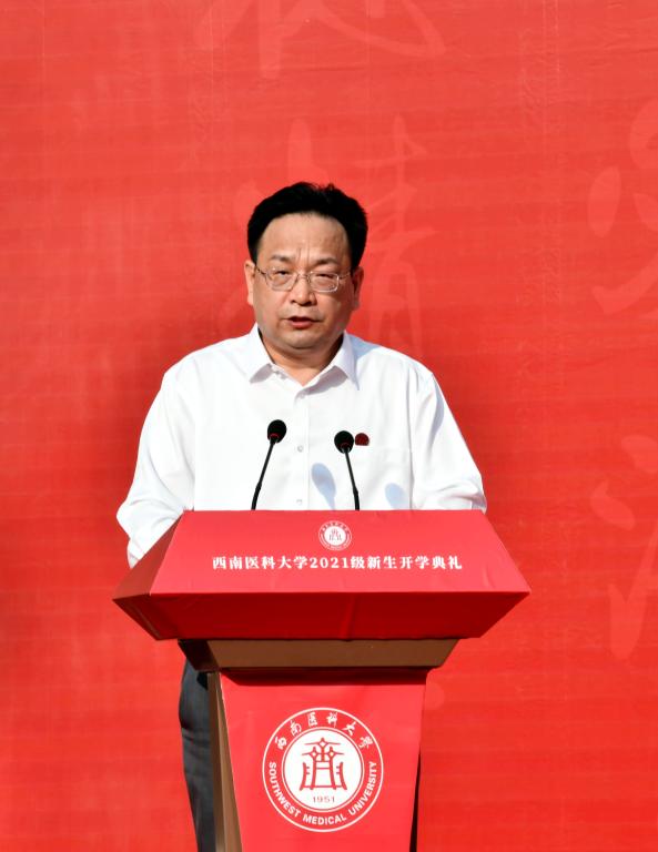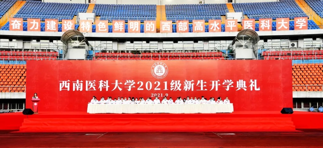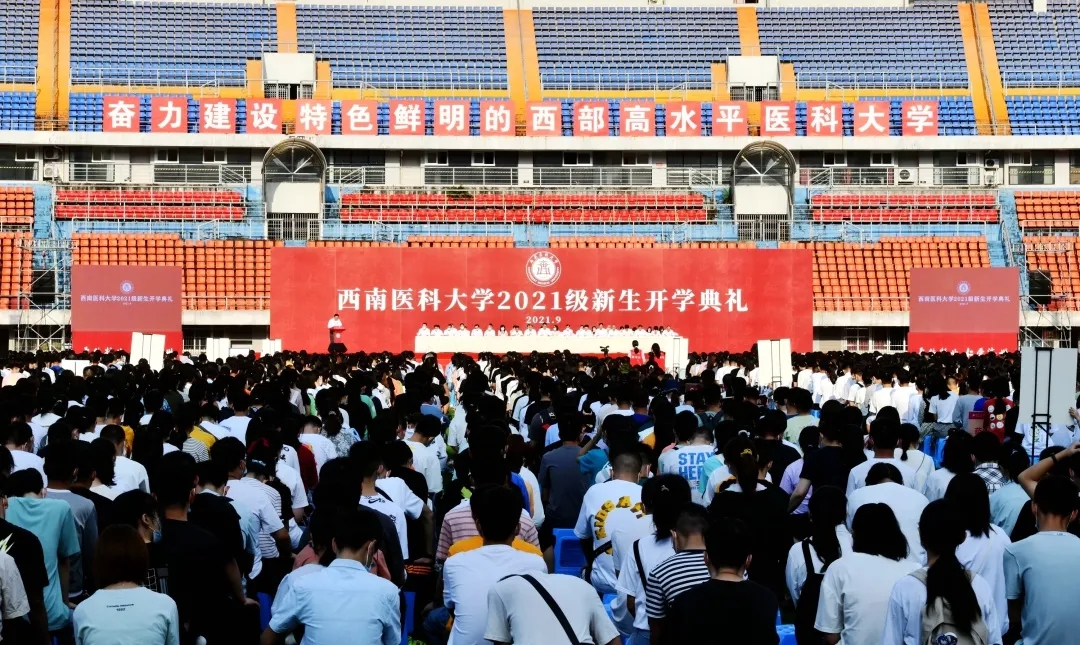9月5日上午8点,西南医科大学在城北校区奥体中心主体育场举行了2021级新生开学典礼,2021级全体本科新生欢聚一堂,开启他们新的人生征程。校领导廖斌、张春祥、李尚志、刘毅、刘广益、彭钢、何涛、聂敏海出席典礼。