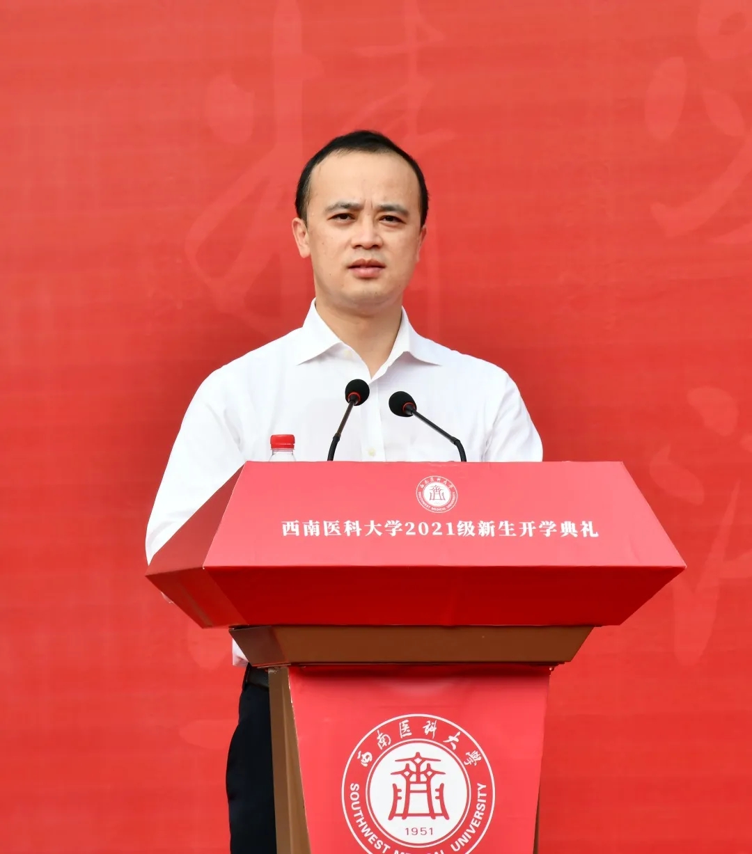 药学院教师、川南医学转化研究院主要负责人肖占刚作为教师代表发言。他以一名老师、一名科研工作者的身份与同学们分享了自己的体会。一是要树立家国情怀,做一名爱国的新时代大学生。二是要珍惜青春时光,做一名奋斗的新时代大学生。三是要胸怀凌云之志,做一名有理想的新时代大学生。坚定理想信念,担当责任使命,以青春之我、奋斗之我,在西南医科大学谱写崭新的人生篇章。