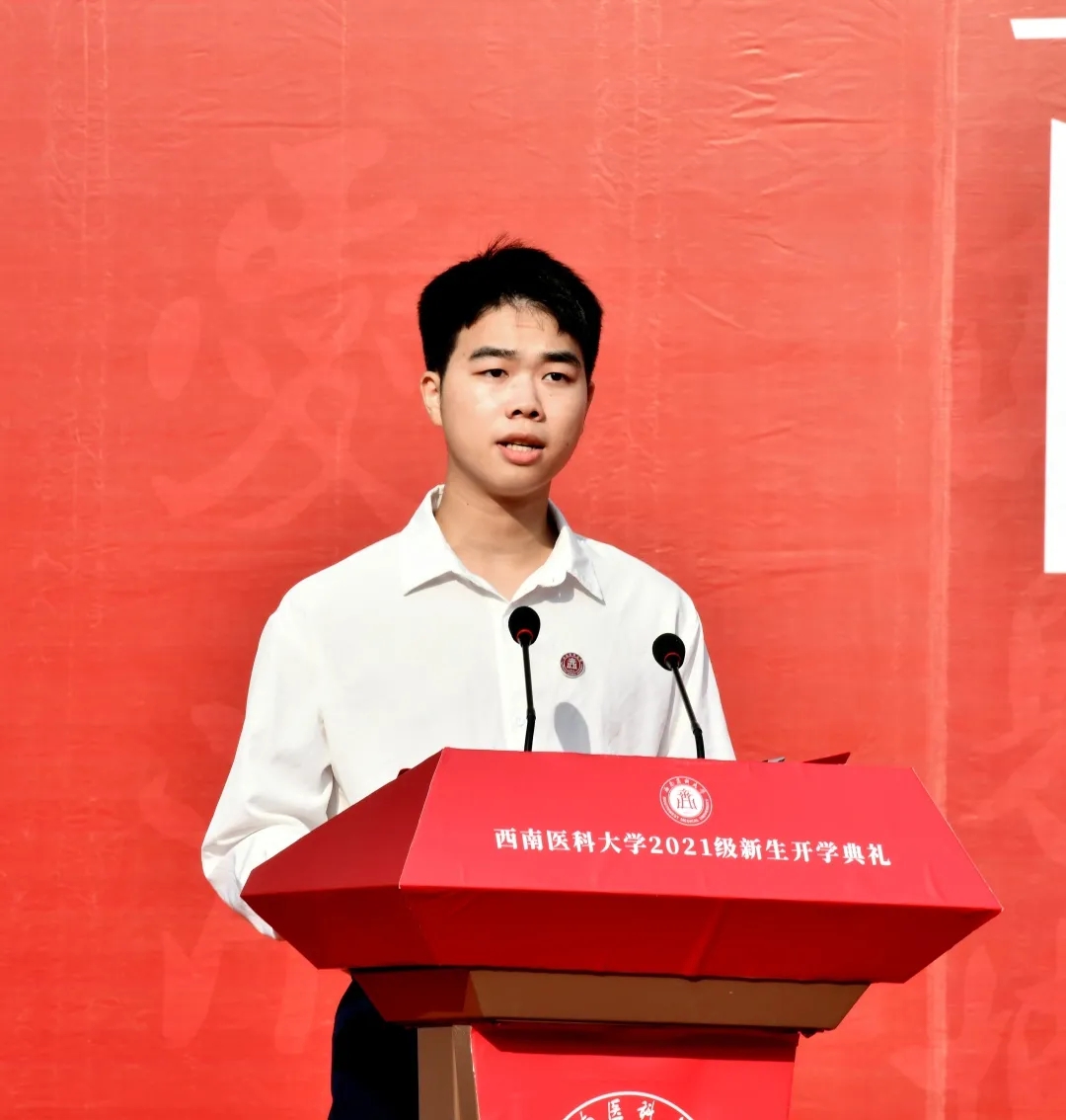 2019级临床医学专业学生、学生会主席团成员胡正新作为学生代表发言。他谈到,在学习生活中,将会遇见明德仁心,兼济天下;执着坚毅,永不言弃;铮铮傲骨,责任担当。要珍惜在西南医大的遇见,勤学善思、求真向善、勇于拼搏、追求卓越,不惧风雨,不畏路遥。始终相信爱与梦想,诗和远方,终将到达!