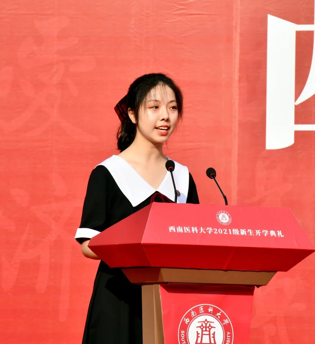 2021级临床医学卓越医师1班关馨作为新生代表发言。她谈到,“新”是即将面临的机会和挑战;“勤”是大学生活应有的模样;“勇”是青年学子应有的气魄。站在新起点,面临新挑战,要坚守心中理想与信念,“不驰于空想,不鹜于虚声”,在西南医大广阔天地中获寻到人生更大的意义。