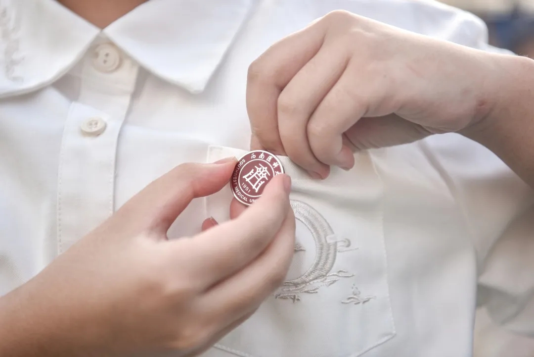 开学典礼在全体起立,佩戴校徽,奏唱西南医科大学校歌中结束。