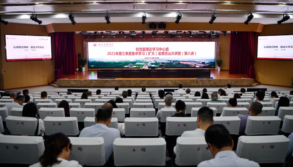 9月22日下午,校党委理论学习中心组2021年第三季度集中学习(扩大)会暨忠山大讲堂(第八讲)在德诚楼学术报告厅举行,西安交通大学原党委书记、陕西省人大常委会副主任张迈曾教授应邀作了《弘扬西迁精神 建设大学文化》专题讲座。讲座由学校党委书记廖斌主持。
