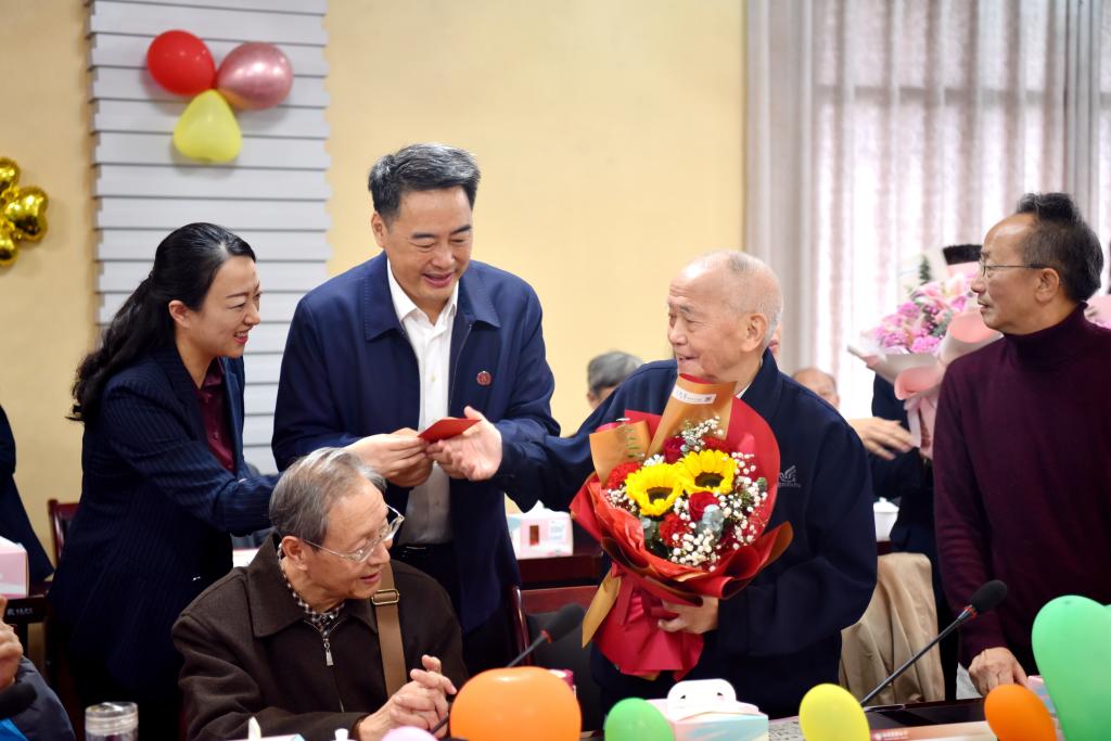 廖斌代表学校党政及全体教职员工向离退休老同志致以节日问候和生日祝福,并从学校近年来在党的建设、学科发展、队伍建设、人才培养、科学研究、社会服务、国际交流合作等方面就取得的成绩,以及近期学校事业发展规划作了通报。廖斌指出,离退休老同志是学校的宝贵财富,学校将一如既往地重视和支持离退休工作,希望各位老领导、老前辈继续发挥余热,为学校发展建言献策、添砖加瓦。