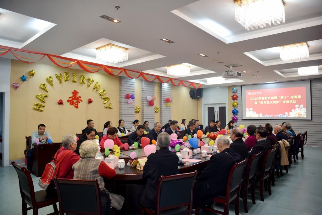 岁岁重阳,今又重阳。10月14日上午,我校2021年重阳节慰问“满十”老寿星暨“我与医大同岁”庆祝活动在城北校区第三会议室举行。党委书记廖斌,党委常委、副校长刘广益,党委常委、宣传部部长柏珂及党政办、组织部、人事处、工会、财务管理处等部门主要负责人参加了活动。活动由离退休党委书记、处长李建英主持。