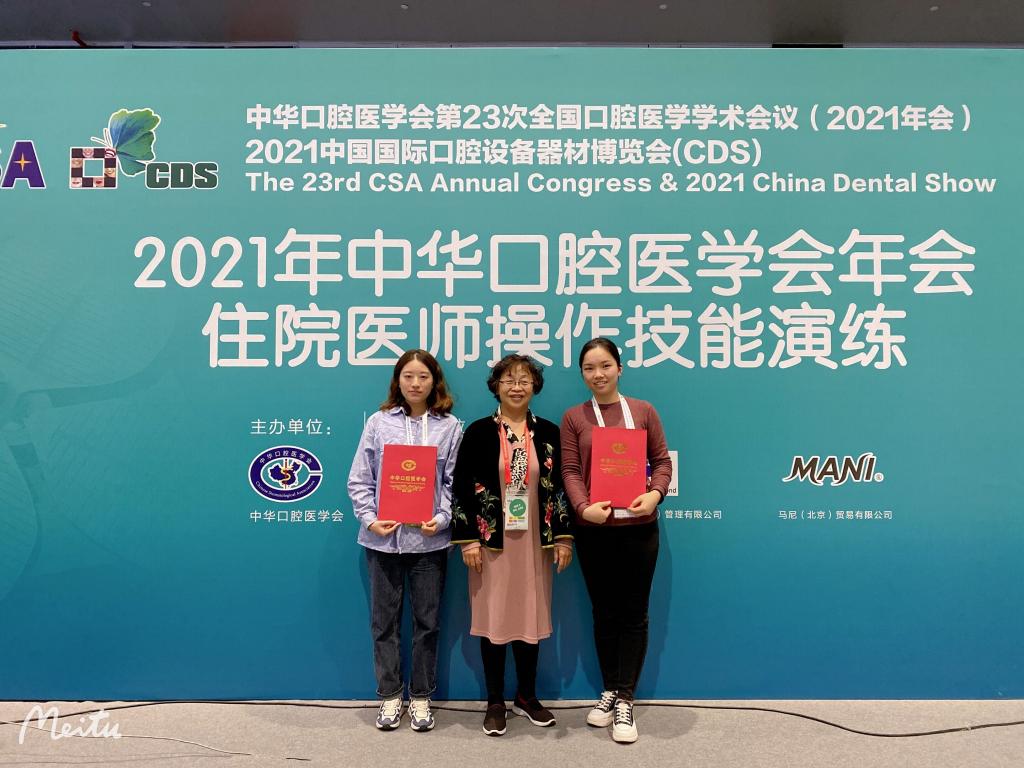 近日,2021年中华口腔医学会住院医师操作技能演练在上海举行。我校口腔医学院·附属口腔医院郭玲教授指导的2019级专业学位硕士研究生、住院医师规范化培训学员张美凤获“车针辨认单项奖”,范丽苑副教授指导的2019级专业学位硕士研究生、住院医师规范化培训学员张瑞获“显微镜下磨牙开髓单项奖”。