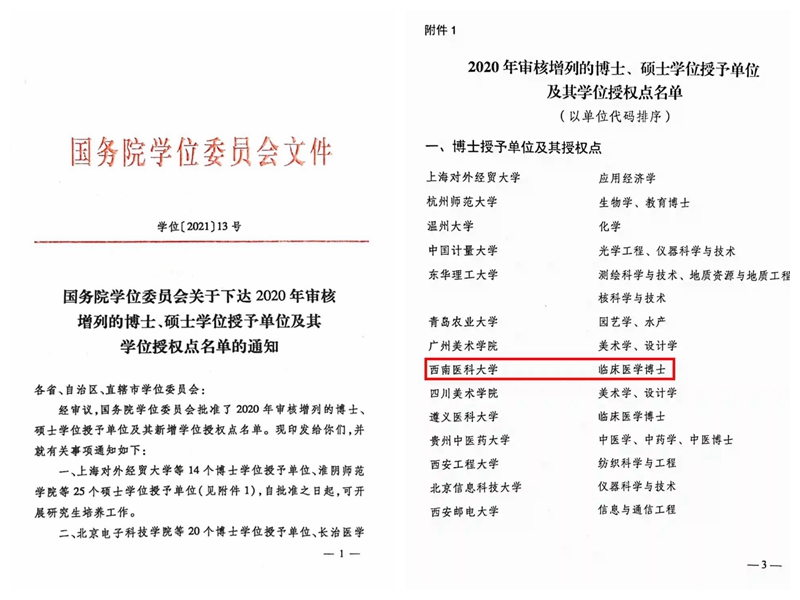 近日,国务院学位委员会发布《国务院学位委员会关于下达2020年审核增列的博士、硕士学位授予单位及其学位授权点名单的通知》(学位〔2021〕13号),我校正式获批成为博士学位授予单位,临床医学获批博士专业学位授权点,自批准之日起,可开展研究生培养工作。这标志着我校实现了博士学位授权点“零”的突破,形成了“本、硕、博”完整的学位授权体系,学校综合竞争力和办学水平迈上新台阶。