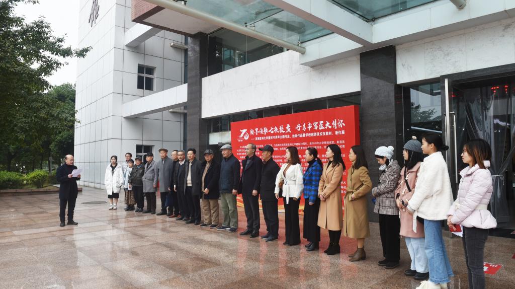 为庆祝学校建校70周年,展示70年办学历程,学校建校70周年主题书法、绘画作品暨学校教师及校友教材著作展于11月18日正式开展。党委常委、副校长彭钢,学校原党委书记叶怀祥、尹杰霖,党委宣传部、工会、团委、离退休工作处、图书馆、校友办相关负责人,泸州市书法家协会主席李在兵,以及部分教师、弘文书社学员代表参加开幕仪式。开幕仪式由校庆办常务副主任陶瑞宇主持。