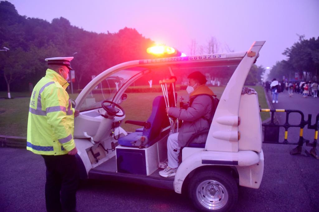 在保卫处工作人员的帮助下,匡同学顺利坐上了巡逻车并被护送至明理楼考场外。专车接送,协助扫描场所码、护送至考场……面对学校无微不至的关怀,匡同学不断表达着感谢。到达考场后,考场工作人员看到行动不便的匡同学,主动上前为其测量体温、检查健康码、行程码、核对身份信息……在考场工作人员的暖心帮助下,匡同学顺利进入考场。