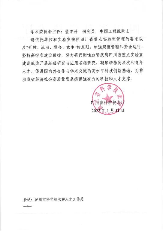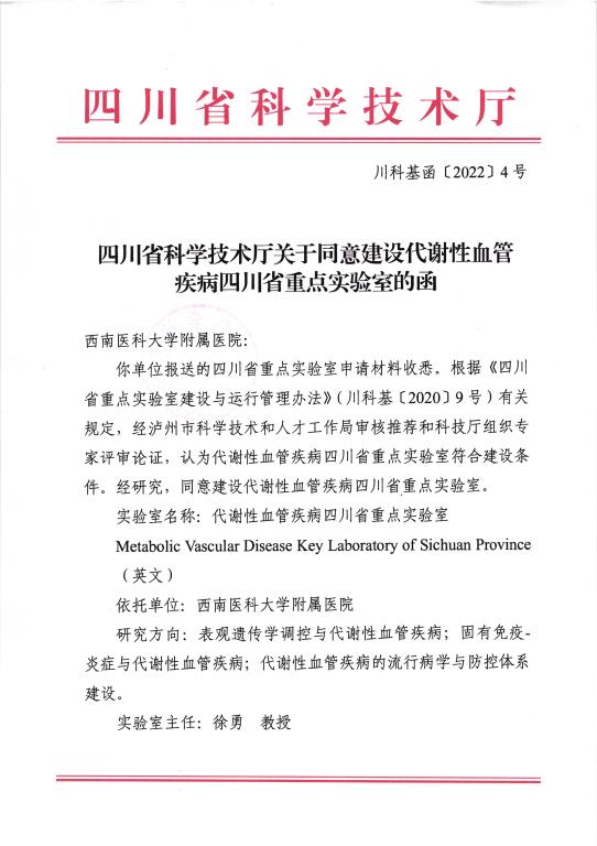1月14日,从四川省科学技术厅获悉我校代谢性血管疾病实验室已正式获批建设四川省重点实验室。目前,学校已拥有医学电生理学教育部重点实验室1个,核医学与分子影像等四川省重点实验室3个,中药活性筛选及成药性评价等泸州市重点实验室16个,本次获批建设的代谢性血管疾病四川省重点实验室为学校第4个四川省重点实验室。