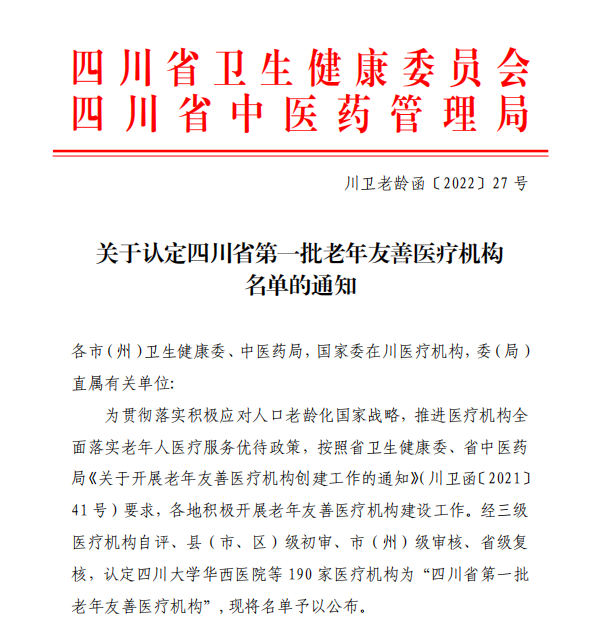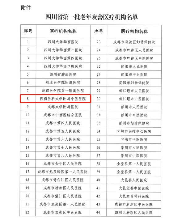 为贯彻落实积极应对人口老龄化国家战略,推进医疗机构全面落实老年人医疗服务优待政策,经自评、初审、审核、复核,2022年2月7日,四川省卫生健康委员会、四川省中医药管理局发布《关于认定四川省第一批老年友善医疗机构名单的通知》,西南医科大学附属中医医院获批为四川省第一批老年友善医疗机构。