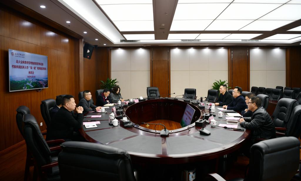 近日,北大金秋教育管理集团投资事业部邹洪波总经理一行5人到我校考察“双一流”规划建设情况。座谈会在城北校区德诚楼一会议室举行,学校党委副书记、校长张春祥,泸州市教育和体育局机关党委书记匡子兵参加了座谈。会议由发展规划处处长赵领主持。