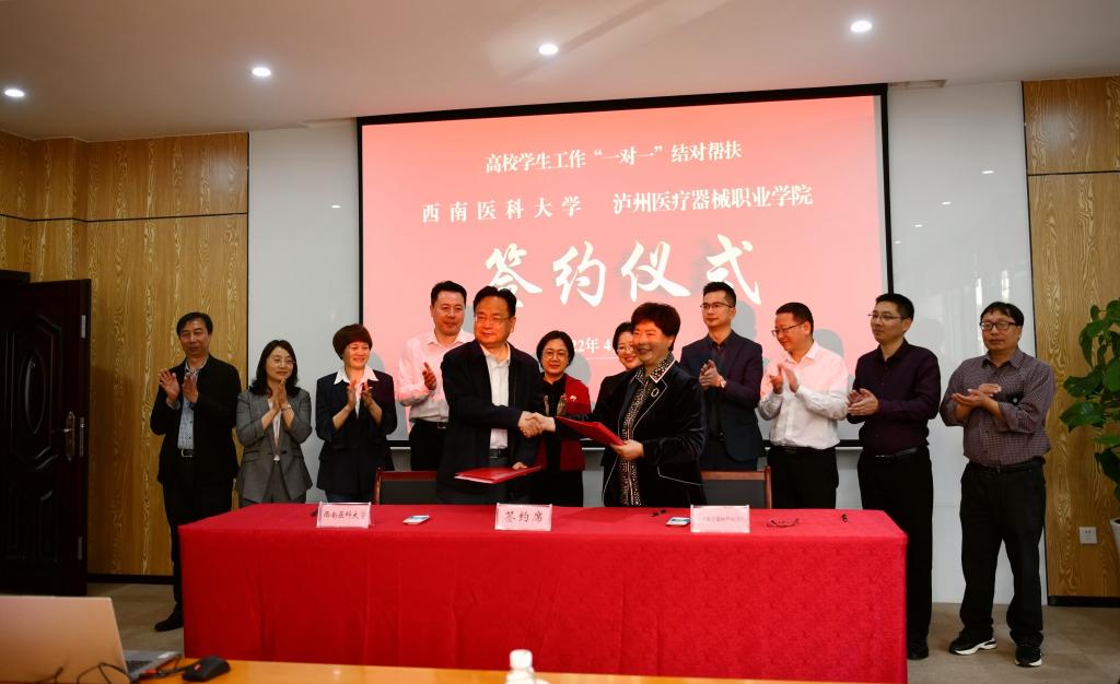 4月12日下午,西南医科大学与泸州医疗器械职业学院学生工作“一对一”结对帮扶签约仪式在泸州医疗职业器械学院210会议室举行。西南医科大学党委副书记、校长张春祥,党委副书记刘毅,西南医投集团党委书记、董事长黄露,副总经理熊晓斌、陈山,泸州医疗器械职业学院院长鞠梅、党委书记唐家州、副院长姚毅、邹青以及两校党政办公室、学生工作部(处)、教务处等相关处室相关人员参加签约仪式。仪式由熊晓斌主持。