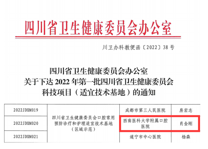 近日,四川省卫生健康委员会办公室发文,公布了2022年第一批四川省卫生健康委员会科技项目(适宜技术基地)名单。附属医院四川省妇科及乳腺疾病治疗中心(妇科)获批“四川省卫生健康委员会‘两癌’筛查适宜技术基地(区域示范)”,肝胆外科获批“四川省卫生健康委员会实用微创适宜技术基地(区域示范)”;附属口腔医院获批建设省卫健委口腔常用预防诊疗和护理适宜技术基地(区域示范)。
