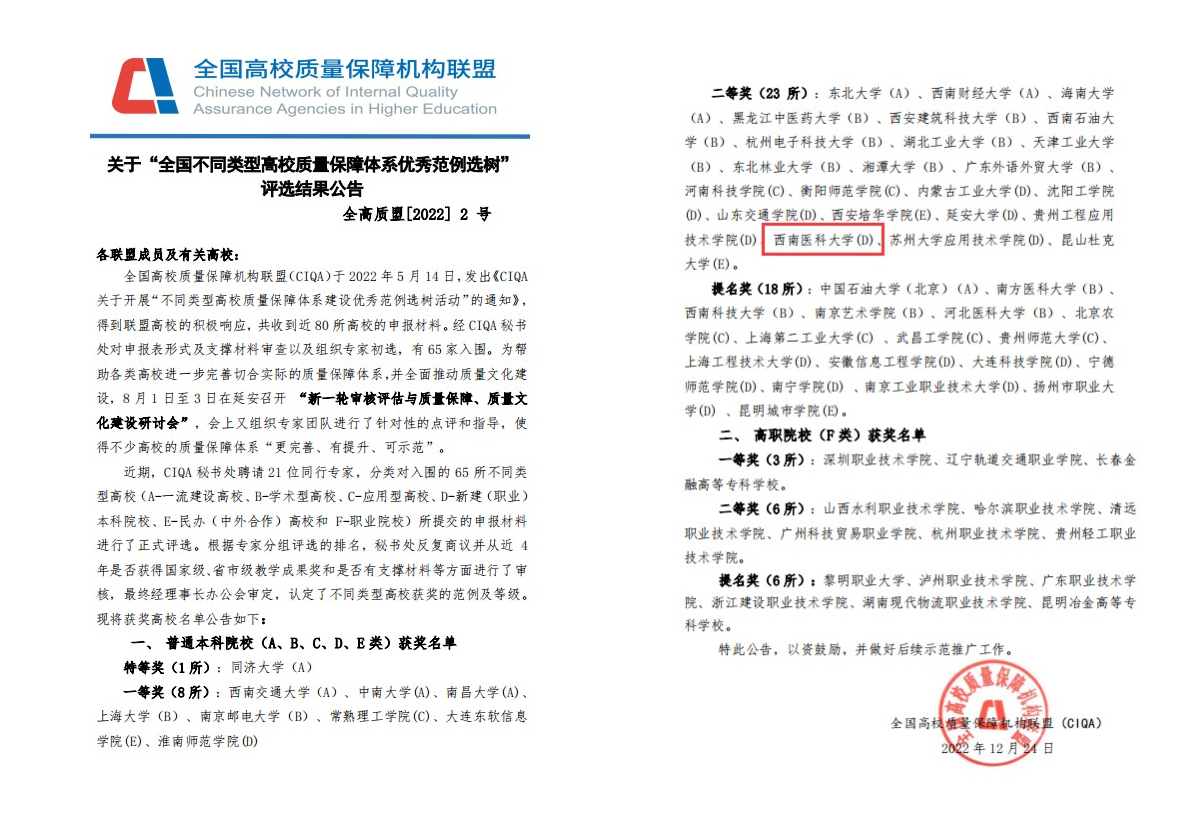 全国高校质量保障机构联盟(CIQA)于2022年5月发布《CIQA关于开展“不同类型高校质量保障体系建设优秀范例选树活动”的通知》,有80所高校积极申报。CIQA秘书处聘请21位同行专家,分类对入围的65所高校提交的申报材料进行了评选。其中,西南医科大学选送的质量保障体系案例:“教学决策、教学运行、条件保障、质量监控、信息收集、质量改进”六位一体的质量保障体系,“教师教学质量专项评估、课程质量专项评估、实践教学基地专项评估、毕业论文(设计)质量专项评估、毕业生就业质量专项评估、专业办学质量综合评估”多维评估,打造“全员参与、全程监控、全面改进、循环闭合”的质量保障运行模式,得到评审专家的一致认可,获评二等奖。
