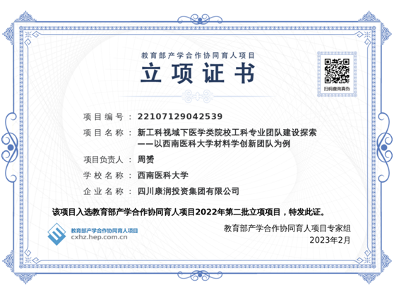 近日,教育部高等教育司下发《关于公布2022年第二批产学合作协同育人项目立项名单的通知》(教高司函〔2023〕1号),医学信息与工程学物理与电子技术教研室教师周赟申报的《新工科视域下医学类院校工科专业团队建设探索——以西南医科大学材料学创新团队为例》项目获批立项。